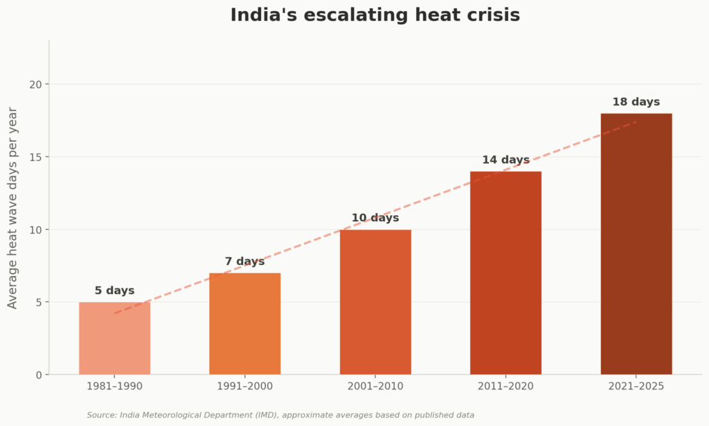 India is on the front lines of a global crisis. The India Meteorological Department (IMD) has documented a sharp increase in the frequency and duration of heat waves since the 1980s. What was once a two-week ordeal in a handful of states now stretches across months and across the country. The consequences ripple outward — from glaciers to groundwater, from crop yields to city streets.