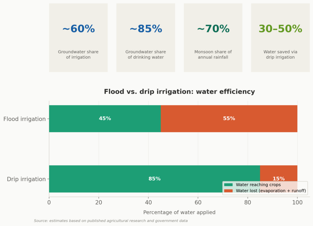 Groundwater, which supplies roughly 60% of India’s irrigation and 85% of its drinking water, is being extracted far faster than it is recharged. The Central Ground Water Board has flagged hundreds of districts as “over-exploited” or “critical.” Rising temperatures increase crop water demand, accelerating the drawdown. In states like Punjab, Haryana, and Rajasthan, the water table has dropped dramatically over the past two decades.